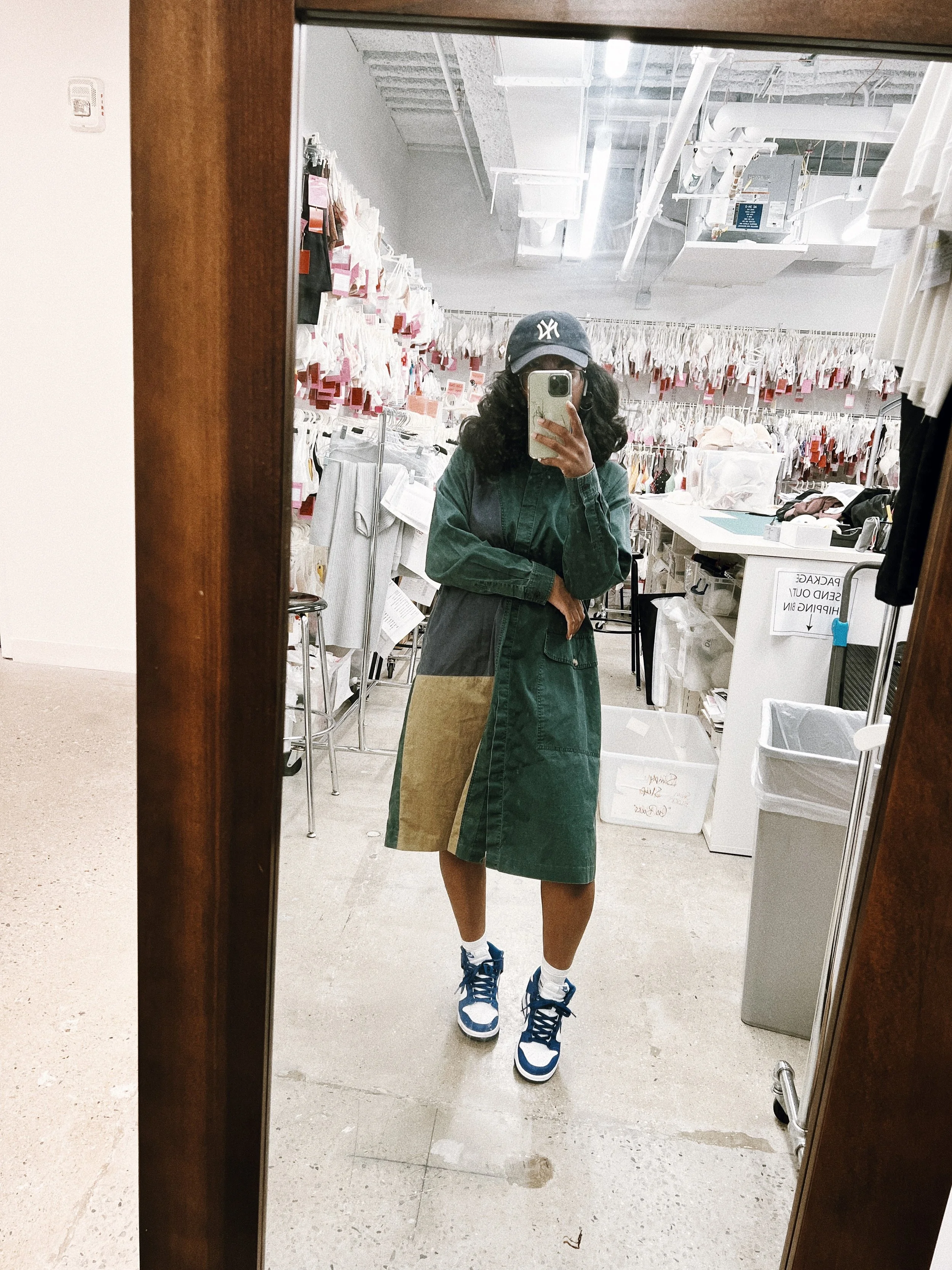Speaking of the big city, I rocked a borrowed NY dad cap with my vintage Dries Van Noten painter’s shirt, which I wore as a dress. I purchased this from Beacon’s Closet years ago. It’s such a simple, but cool throw on. I love a good dress + sneaker combo.