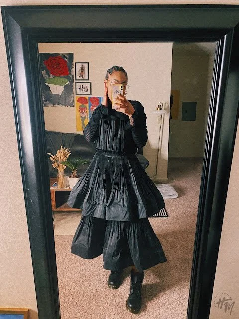 After my work celebration, I enjoyed a nice dinner with my fambam (do people say this anymore? lol). I made a complete 180 with my color scheme and opted for an all-black look. I thrifted this Alexis dress, and I’m so happy I bought it because I can’t find it on the web anywhere—unless my investigative skills just suck. But more on the dress: it's a sleeveless, pleated tier dress, and it makes me feel like I’m in an Alexander McQueen show or something.