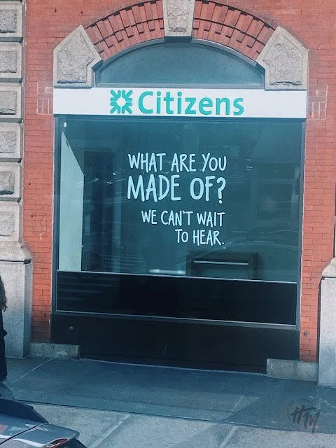 I spent the day (outside of working, of course) snapping photos of random sayings near my job while walking to Chopt. This one on the window of a Citizen’s Bank caught my eye: What are you made of? Ya’ll know I like to get deep into my self-reflections so this really stood out to me.